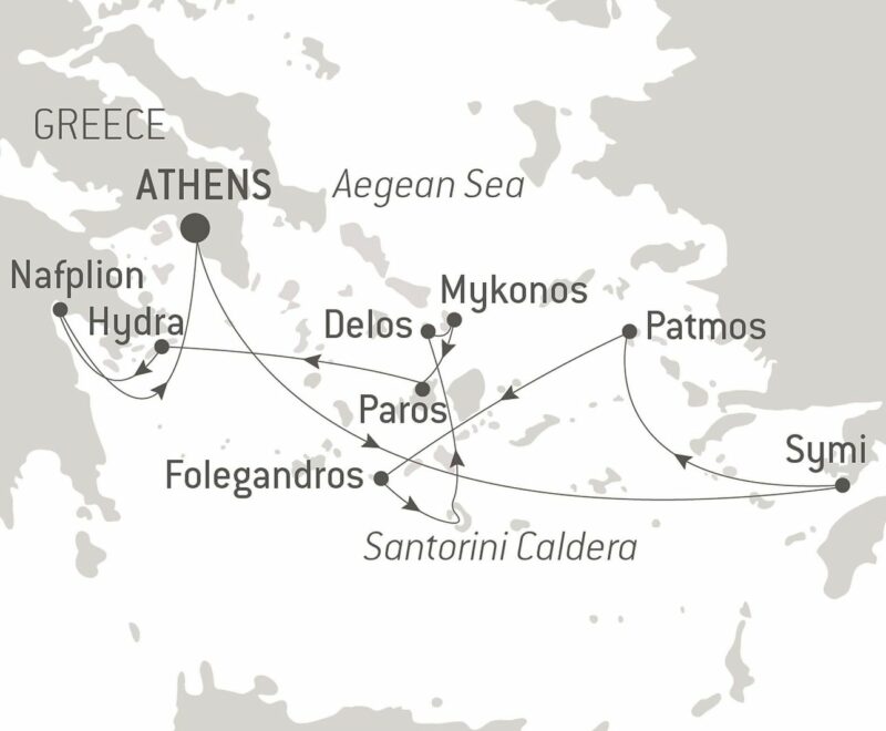 Da Atene, Le Lyrial ti porterà in siti eccezionali durante una crociera di 9 giorni. Scoprirai Patmos, conosciuta come la “Gerusalemme del Mar Egeo”, Santorini e la sua bellissima caldera vulcanica,la piccola Delos,  Mykonos, con le sue famose spiagge e i mulini a vento e l’isola di Hydra, rinomata per la sua luce incomparabile.
