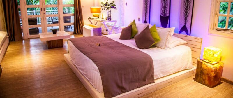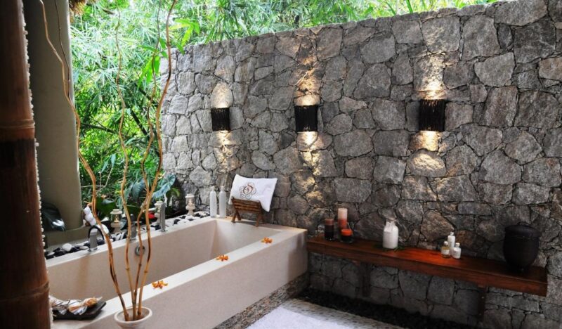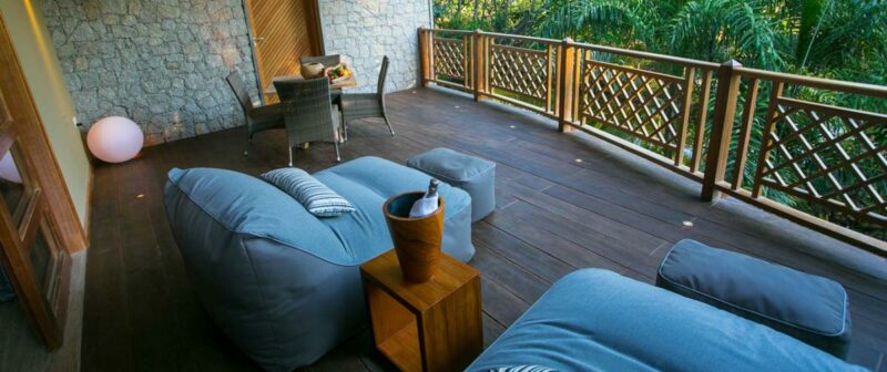 Ci soffermiamo qui sulla descrizione delle VILLE DI CHARME: un gioco di architetture alterna spazi interni ed esterni, l’andito sotto le stelle cede il passo ad una grande suite con zona relax di divani, cuscini, candele, olii profumati in fornellini da aromaterapia. L’enorme letto a baldacchino è il protagonista della zona notte affacciata su un grande terrazzo sospeso sulla foresta, a volte poggiato sui massi granitici, altre sorretto da tronchi di alti alberi che lo trapassano letteralmente. Consolle con lampade artistiche, una funzionale stanza guardaroba introducono alla “sala” da bagno all’aperto con una grande vasca incorniciata da candele e profumate essenze naturali, doppio lavandino, una fantastica doccia multigetto tra altissime canne di bambu e giochi di conchiglie appesi a cordoncini che la notte si colorano per gli effetti di faretti posizionati strategicamente. Possono essere vista lago, foresta o vista mare .