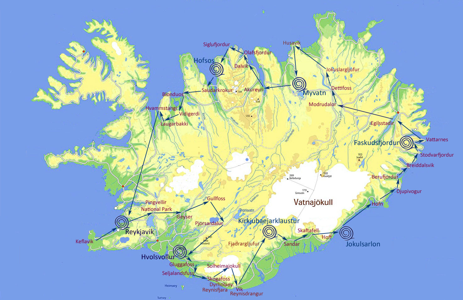 Uno tra i piu’ completi itinerari da svolgere in liberta’ con la vostra auto a noleggio. E’ facilissimo e meraviglioso percorrere tutta la ring-road (statale ad anello su cui girare tutta l’Isola, pochissimo trafficata) con qualche deviazione nel cuore del Paese. Vi consiglieremo ristoranti, i luoghi nascosti da scoprire e mille consigli utili per farvi trovare “a casa vostra” non appena scesi dall’aereo. Vi proponiamo ottime sistemazioni, in posizione da sogno o nei paesini di pescatori, alternando camere d’hotel, appartamenti, chalets, agriturismi. Ogni viaggio è personalizzabile, in durata, tappe, attività